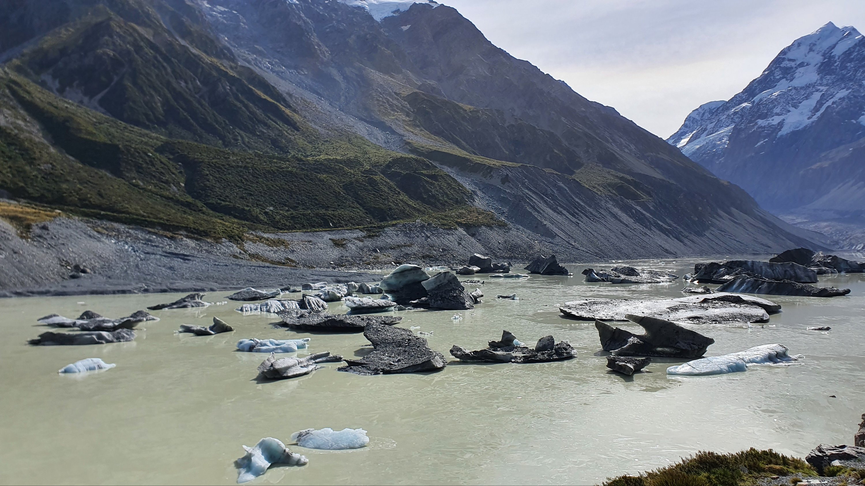Hooker Glacier measuring 11 kilometres in length, is one of several glaciers close to the slopes of Aoraki / Mount Cook in the Southern Alps of New Zealand.