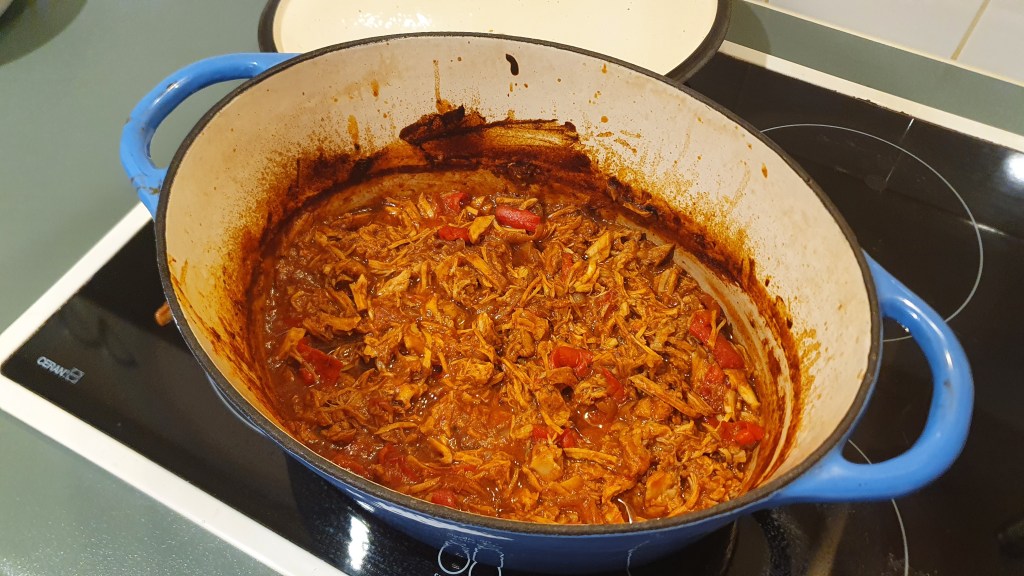When the meat is tender, remove into a dish and pull pork apart with two forks – or ‘bear claws’ if you are from North Carolina and feeling extra especially manly. Remove any bones and strips of skin / fat. Return shredded meat to sauce in casserole and mix around.