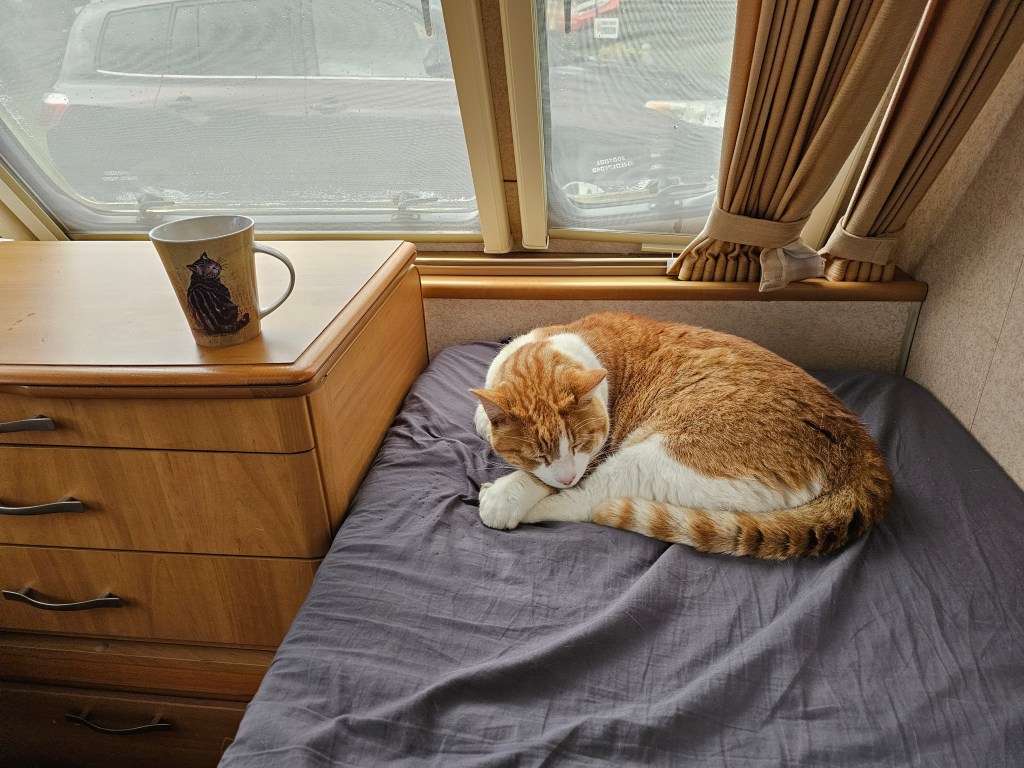 Not needing to be asked twice Mower hopped up and quickly made himself at home at the end of the bed. For a start, he thoroughly inspected the soundness, and softness of the bed – (bambillo topper pad on top of the standard issue squab) – by making biscuits, his enormous paws and claws spreading out wide in alternating interrogative pulses.