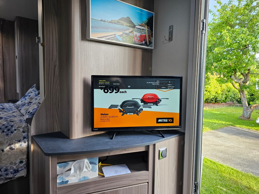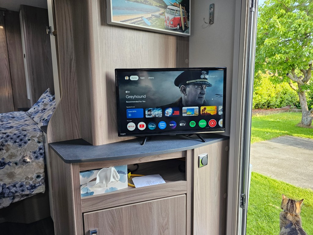 I set the TV up in the caravan, using the 12V power supply and a hotspot from my phone for wi-fi access. Basically this is how I will use the TV when travelling off grid. The set up was very straight forward. I set up the broadcast TV first using the caravan aerial for the first time. Scanning and finding all the digital free to air channels was easy. After carefully raising the caravan aerial and pointing it vaguely in the direction of the Auckland TV transmitter, I later discovered that in Auckland at least, that the digital channels work just fine with the aerial down – we will see what happens once we get out of the main centres. Next I set up the Google TV features which again was easy, by simply following the prompts on the screen. Netflix was a little fussy, sending emails “is this really, really you”… but in the end it decided that I was bona fide.
